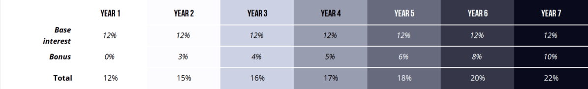 On top of the 12% annual interest, an investor that retains the investment will receive an additional annual bonus that grows each year